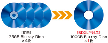 大容量のBDXL™対応Blu-ray Discは、従来の25GB Blu-ray Disc4枚分の約153時間(注7)の録画番組を1枚に保存可能(注8)。大切な番組をたっぷり残せます。