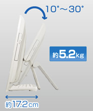 約5.2kgの軽量ボディーと奥行き約17.2cmの省スペース設計。液晶下部にキーボードを収納でき、お気に入りの場所への設置もスッキリ。さらに、10°〜最大30°まで無段階にチルトが可能で、使う人に最適なポジションに調整できます。
