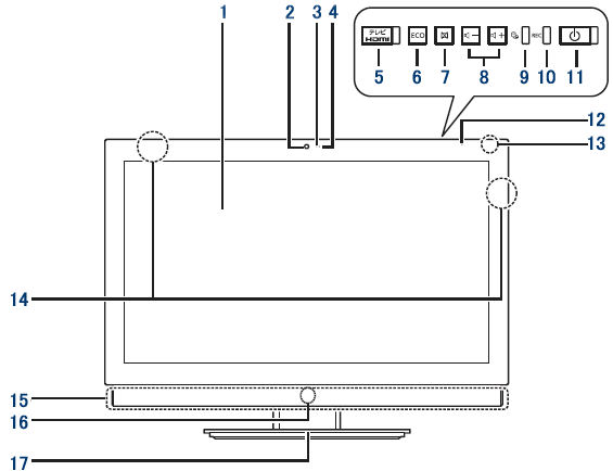 | 8. | クイックテレビ[注]/ 外部入力ボタン、クイックテレビ[注] / 外部入力ランプ |