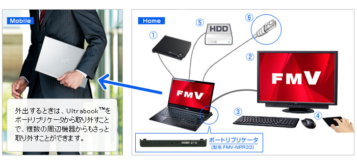 さまざまなコネクタ類を接続可能にするポートリプリケータを使用すれば、家に着いてすぐに一括接続することができます。 モバイルパソコンからあっという間にホームパソコンに変わります。 また、複数のコネクタに接続していても、ポートリプリケータからパソコン本体を取り外し、すぐに持ち出すことができます。