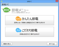 「かんたん節電」では「画面の明るさ調整」、「画面の電源オフ」、「スリープまでの時間設定」など、初心者にもわかりやすいウィザード形式で設定することができます。