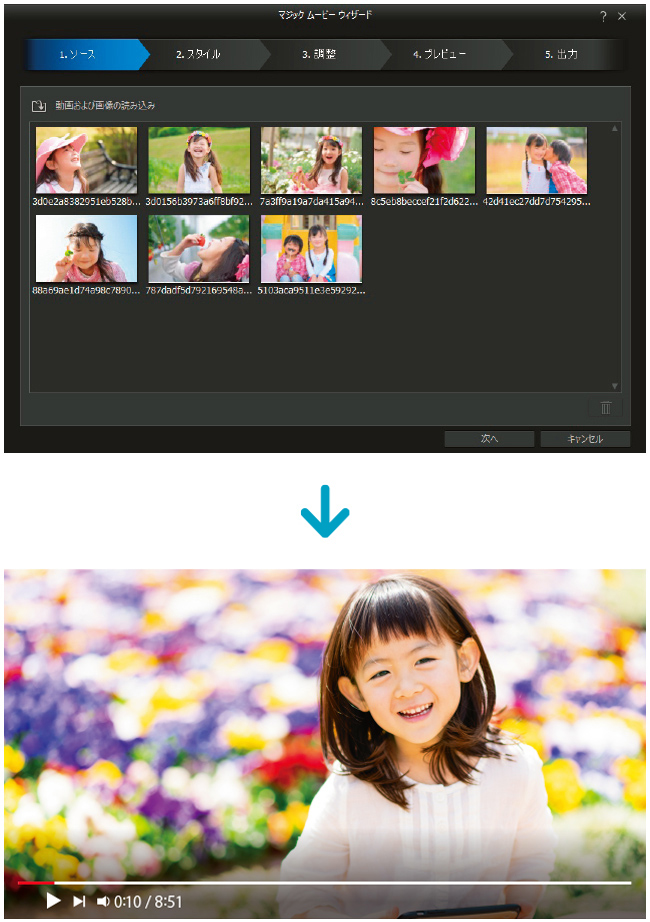 「PowerDirector」は、直感的な操作でかんたんに編集ができる人気のアプリ。ビデオカメラはもちろん、スマートフォン用の縦向き動画やSNS用の正方形動画の入力、編集、出力に対応しています。完成したオリジナルの動画をSNSに公開したり、ディスクに残したり。初めての方から上級者まで幅広く楽しめます。