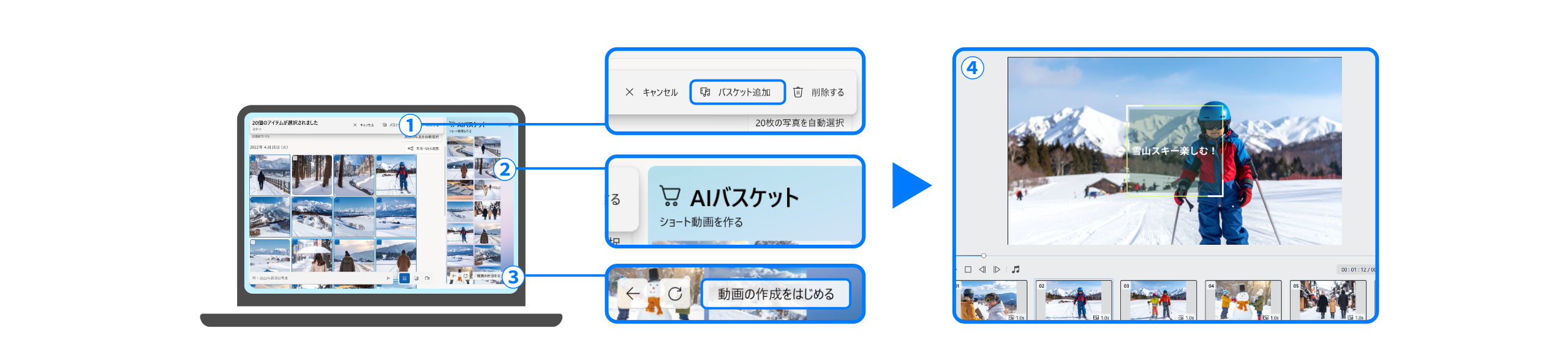 動画や写真を選択し、アプリ内の「AIバスケット」に入れて「動画の作成をはじめる」をクリック。