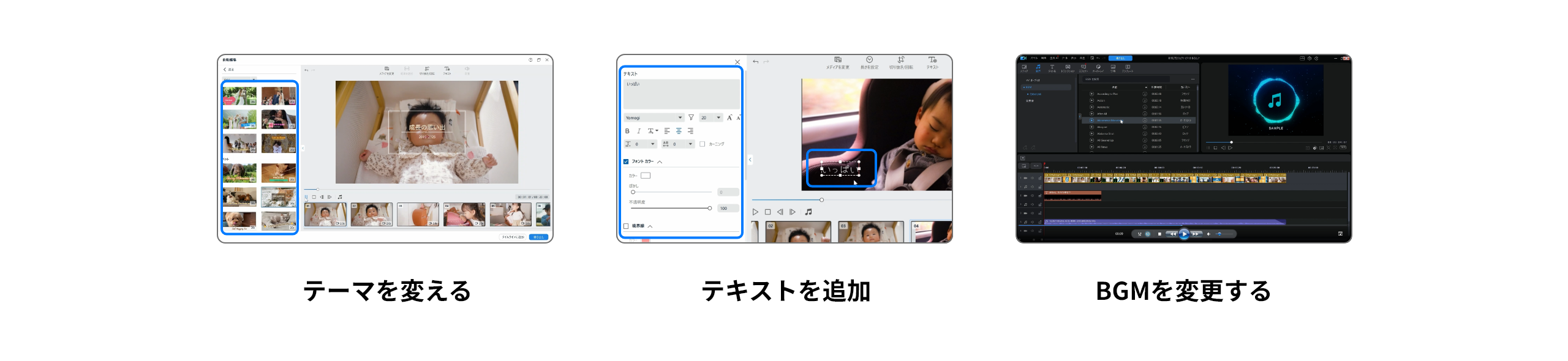 生成された動画はお好みのイメージに合わせてテーマを変えたり、テキストを