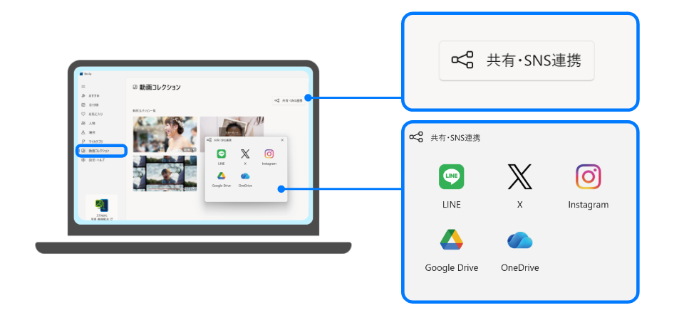 フォルダに保存されます。動画を選び「共有・SNS連携」を押せば、簡単に