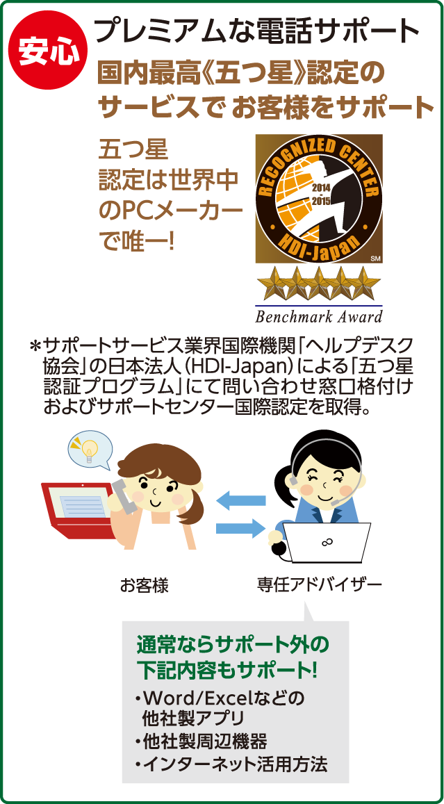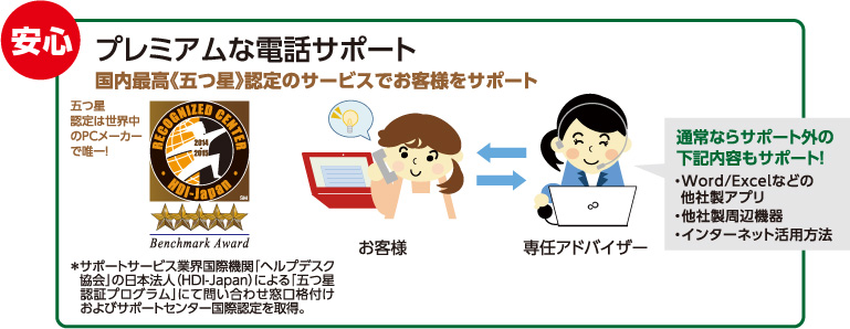 他社製ソフトの設定使い方や各種インターネットサービスの活用など、通常のメーカーサポートのレベルを超えた相談にも対応。