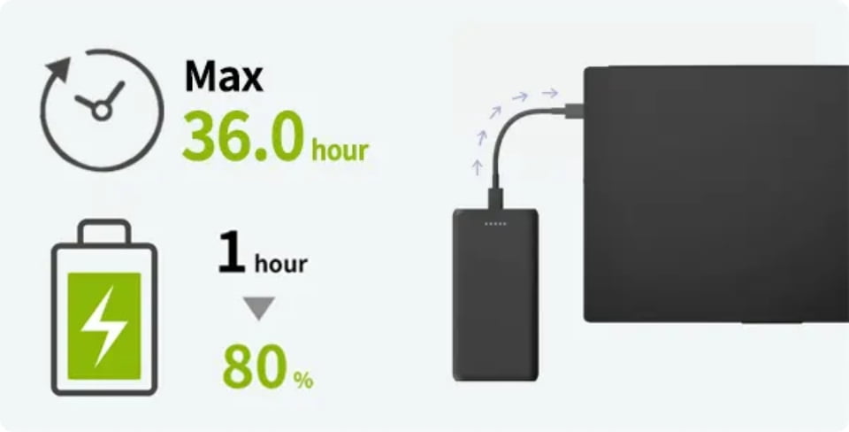 Type-C充電対応のため、スマートフォン用に持ち歩くモバイルバッテリー(※)などを使用して充電が可能。複数の充電器を持ち歩かずに済むので、さらに身軽に移動できます。
