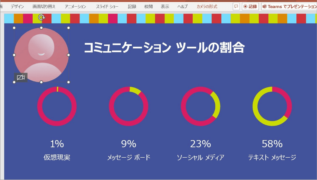 カメラ映像を組み込みよりインパクトを顔出しをしながら各スライドの発表をすることができ、より魅力的で説得力のあるコンテンツに仕上がります。また、リモートワークやオンライン授業など、対面でのコミュニケーションが難しい場合にも役立ちます。