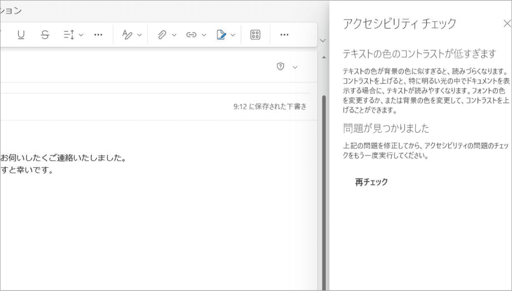 伝わりやすいコンテンツ作成をサポート作成したメールや資料の中で、読み取りにくい内容を自動で見つけ出し、おすすめの修正方法を提案してくれます。この提案により内容が読みやすくなったり、スクリーン リーダーを使用する人にもわかりやすく伝えられるようになります。