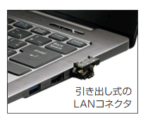 薄くて持ち運びやすいUltrabook™でありながら、USB3.0×2、HDMI出力端子×1、SDカードスロット×1と、充実のインターフェースを搭載。様々な機器との連携がスムーズです。さらにUH90/Mは、引き出し式のLANコネクタを装備しているので、LANケーブルを直接挿して使用することができます。
