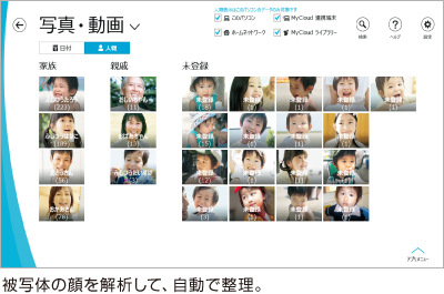 パソコンに写真を取り込むと、「My Cloud」が自動で整理。日付や人の顔ごとに整理してくれるので、お目当ての写真をサッと探すことができます。また、自動でアルバム作成してくれるので、くっきり鮮やかな思い出の写真を手軽にきれいに楽しめます。