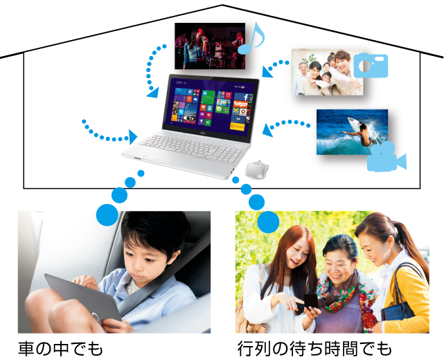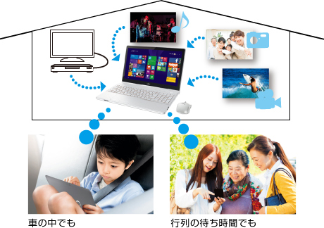 録画しておいた番組や、パソコンにためておいた音楽など、自宅にあるコンテンツをスマートフォン、タブレットで、外出先から楽しめます。自宅でも、ワイヤレスで録画番組を視聴できるので、テレビの楽しみ方が広がります。ダウンロードもワイヤレスでかんたんにできるので、外出先で電波状況を気にすることなく楽しめます。