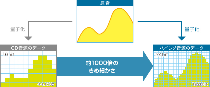 ハイレゾの音源とは、音楽CDと比べ最大約6.5倍の情報量を持ち、より原音に近い音といえます。AH90/X、AH77/W、AH53/X、FHシリーズ、WA3/W、WF1/Xは、ハイレゾの音源を再生可能なスピーカーを搭載しています。これによって、原音をより忠実に再現するので、録音されたときの空気感・臨場感まで味わえる高音質なサウンドが楽しめます。また、ハイレゾ対応ヘッドホン(別売)にも対応し、シチュエーションに合わせてスピーカーとの使い分けも可能です。