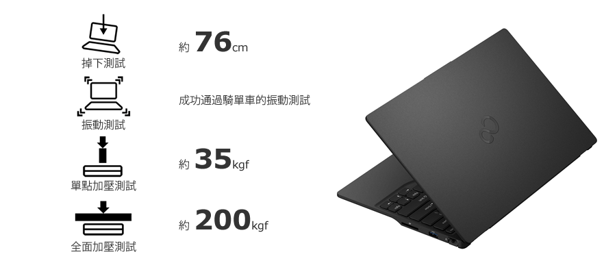 為了同時顧及機身輕盈和強固設計,我們在多方面下了功夫。如成功通過在擠迫的車廂中受壓迫,或從桌子上掉下等嚴格的耐用度測試,讓您放心攜帶筆記簿電腦外出及使用。
