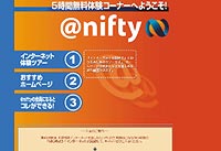 | ビブロで@niftyに入会すると、3ヶ月接続料無料でインターネットを使い放題。入会手続きも画面上の簡単操作で完了。その後、すぐにインターネットを存分に楽しめます。 |  |