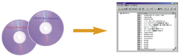 | テーマを決めて、音楽CDなどから好きな曲を取り込んだら(Wave形式・RA形式)、聴きたい順にクリック。これだけでプレイリストが完成し、いつでもその通りに再生できるオリジナルアルバムがつくれます。