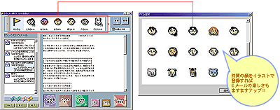 | メールを読むのも書くのも、1つのウィンドウ内に わかりやすく統一。Eメールは初めてという方でも、簡単に操作できます。CCDカメラから画像を取り込めば、動画や静止画付きのEメールもらくらく。また、メール相手ごとに交信履歴を表示したり、 相手の顔のイラストを登録しておくことで、Eメールがますます楽しく、スムーズになります。 |  |
