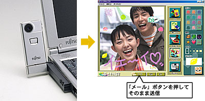 添付の着脱式のCCDカメラ『Easyshot』(*)や、お手持ちのデジタルカメラから取り込んだ写真の上に、絵や文字を自由に描くことができます。あらかじめ搭載されている「スタンプ」や「イラスト」を使えばお気に入りの写真が、より彩やかに 変身。さらに、ソフト上のボタンで「らくらく メールBOX」を起動させて、作った画像をそのままEメールで送ることもできます。アイデア いっぱいのEメールで、楽しさもグーンとアップ!