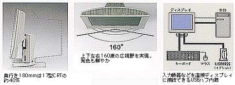 相当)。17型CRTの1/2以下の設置面積および約1/3の消費電力。また富士通独自のMVA※2パネルの採用による上下左右160度の広視野角と高速応答、コントラスト(300:1)などにより、明るい部屋でもくっきりと鮮明です。またUSBハブ内蔵のため、直接キーボードや周辺機器を接続できます。