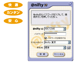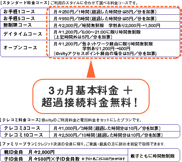 | ※ | 3ヵ月無料期間中のアクセスポイントまでの電話料金および各種有料サービスのご利用料金はお客様のご負担になります。 |