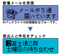 | 新着メールの差出人と件名が、ワンタッチのボタン操作で確認できます。メールの到着は光とメロディでお知らせ。差出人に合わせてバックライトを7色の中から選べます。友達からはレッド、家族からはブルー、仕事の同僚からはグリーンなど、自分だけの設定でメールのやりとりがもっと便利にもっと楽しくなります。 |