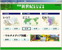 多様な機能をもったパソコン上で使う百科辞典です。「いつ?(年表検索)」、「どこ?(マップ検索)」、「だれ?(人名検索)」から簡単に検索できます。マルチメディア図鑑を利用すると、写真を見ながら動物、昆虫、花について調べることができます。見出し語を利用してインターネットのホームページから検索することもできます。