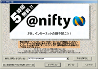 @nifty(アット・ニフティ)に接続し、5時間まで無料で、インターネットを体験できるアプリケーションです(ただし、アクセスポイントまでの電話料金は別途かかります)。ホームページの使い方やおすすめのホームページ集などが用意されていて、インターネットが初めての方でも、簡単にインターネットの楽しさを体験できます。