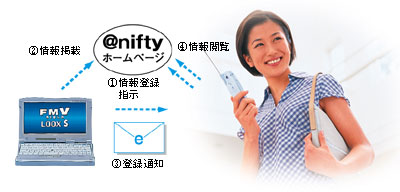 iモードからスケジュール帳を@niftyのホームページ(*)に登録するように指示をします。ビブロが登録指示を受けたら、ホームページの情報を自動的に更新して、iモードにメールで登録完了の通知をします。