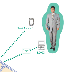| パソコンの達人、お父さんはAirH"INモジュールを搭載したLOOXで、自宅のパソコン宛てに届いたEメールを外出先からチェックしています。※3 |