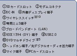 | 注1 MG13Dのみ。注10 MG13D、MG17D/Aのみ。注11 MG17D/Aのみ。注12 MG13Dにおいて増設用バッテリユニット装着時。注13 MG12DのメモリはSDRAMです。また、最大メモリ容量にする場合は、メモリスロットにあらかじめ装着済みのメモリ(256MB)を取り外して、別売の増設用メモリ(512MB)を2枚実装する必要があります。注14 MG12Dにおいて、モバイルマルチベイ用カバー装着時。 | |