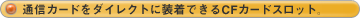 通信カードをダイレクトに装着できるCFカードスロット