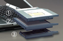 見出しDVDマルチドライブを標準ユニット注1としたモバイル・マルチベイ構造。