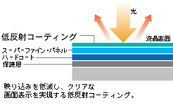 液晶表面をスーパーファイン・パネルで覆い、映り込みを低減する低反射コーティングを施しながら、より明るく鮮明な画面表示を実現。さらに、10.6型高精細ワイドXGA(1280かける768)画面のため、表示領域もワイドです。