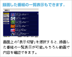 気になる番組はまず録画。ハードディスクにたっぷり録画できるので、あとでゆっくり録画番組を楽しめます。 |