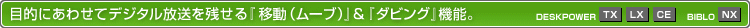 *F:視聴の際は「インスタントMyMedia」、「TVfunSTUDIO」(DESKPOWERのみ)をご利用ください。コピー制御信号が含まれる場合、タイムシフト、録画はできません。別途音声ケーブルを接続する必要があります。