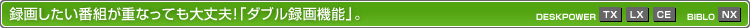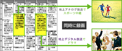 録りたい番組が重なっても地上デジタル放送1番組と地上アナログ放送の1番組を同時に録画できます。 *地上デジタル放送2番組、地上アナログ放送2番組の同時録画はできません。 |