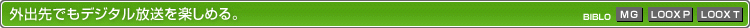 ●内蔵アンテナ:本体内蔵アンテナでビブロを持ち運べばどこでもワンセグが見られます。注10 注8 LOOX T70S/Vを除く。 |
