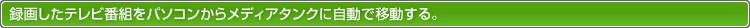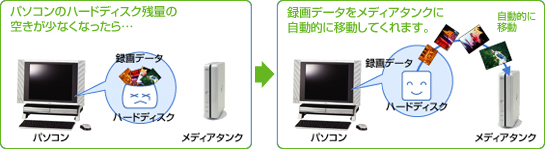 FMVに録画したテレビ番組がハードディスクにいっぱいになる前に、古い番組から順に自動的にメディアタンクに移動してくれます。大容量約400GBハードディスクを搭載しており、地上デジタル放送でも最大約48時間※のテレビ番組を保存できます。 |