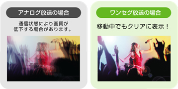 「ワンセグ」は、地上デジタル放送1チャンネルあたりの帯域(6MHz)を13のセグメントに分けたうちの、1セグメントを利用して提供される携帯・移動体向け放送サービスです。通常のテレビと違い、移動しながらでもテレビ映像が乱れずに視聴でき、外出先・通勤途中で楽しめます。また、地上デジタル放送と同じく、番組に関する情報を配信するデータ放送の受信が可能です。2006年4月1日から、東京・大阪・名古屋の3大都市圏をはじめとする地域でサービスが開始されています。 ※詳しくは社団法人地上デジタル放送推進協会(D-PA)のホームページ(http://www.d-pa.org/)をご覧ください。 |