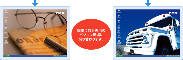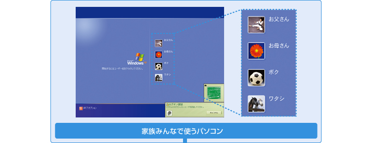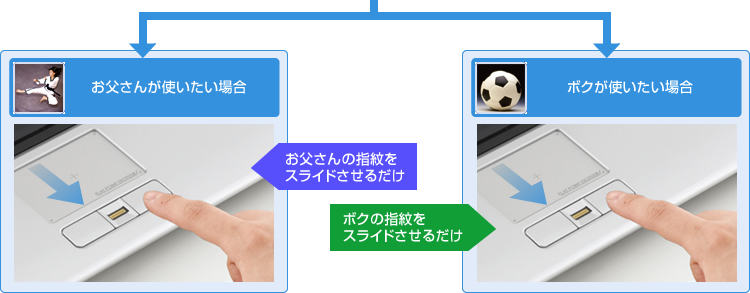 「指紋センサー」を使えば、家族みんなで使うパソコンを簡単に自分専用のパソコン環境に切り替えられます。Windows®のログオン画面で、指先を スライドさせるだけで、事前に設定しておいたメールやインターネットなど自分専用の環境にスムーズにログオンできます。