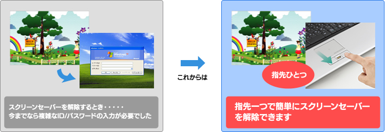 『家族みんなで使うパソコンを簡単に自分専用のパソコン環境に切り替える。』「指紋センサー」を使えば、そんな望みを簡単にかなえます。Windows®のログオン画面で、指先をスライドさせるだけで、事前に設定しておいたメールやインターネットなど自分専用の環境にスムーズにログオンできます。 *事前にWindows®の設定、指紋認証登録などの設定が必要です。 |