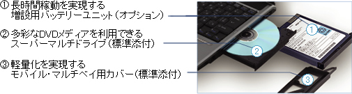 利用シーンに合わせてユニットが取り外せるモバイル・マルチベイ構造を採用。CDやDVDの利用、テレビ視聴、持ち運ぶ際の軽量化や長時間稼働など、使用目的に合わせてユニットを交換することができます。注6 |