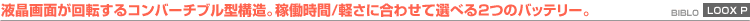 利用シーンにあわせてスタイルを変えられるコンバーチブル型構造を採用。キーボードでの入力はもちろん、ペンやスティックポイントでも操作できます。ペンでは文字入力なども行えるので、ペンだけでも使いこなすことができます。なお、オプションの大容量バッテリーを利用すれば、最大約9.3時間もの使用が可能なので、長時間の外出でも余裕を持って使用できます。また、標準バッテリー装着時は、約997gの軽さを実現。2つのバッテリーが、快適なモバイルライフをサポートします。 |