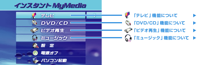 ハードディスクに録画する 注2 テレビ視聴中に急に録画したくなったら、リモコン注1やパソコン本体の「録画」ボタンを押すだけで、注2ハードディスクに録画がスタート。もちろん「インスタントMyMedia」で録画したテレビ番組は、Windows® を起動して「TVfunSTUDIO」や「MyMedia」で再生することもできます。 |