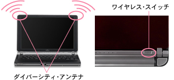 アンテナには受信感度を高めるダイバーシティ方式を採用。2つのアンテナを搭載することで安定した通信環境を実現します。また、ワイヤレス・スイッチの搭載により、ワイヤレス機能のON/OFFを簡単に切り替えることができます。 |