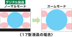 「DigitalTVbox」でリモコンの「画面サイズ」ボタンを押すと、お好みのサイズに合わせて、画面が切り替えられます。16:9のデジタル放送のワイドな映像も、リモコンの「画面サイズ」ボタンで「ノーマル」「ワイド」「ズーム」の3つの表示パターンからお好きな表示で楽しむことができます(アナログ放送は「ジャスト」を含んだ4つの表示パターンから選択できます)。ワイド液晶はもちろん、スクエア液晶でも十分にデジタル放送を楽しめます。