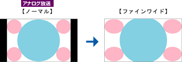 また、4:3のアナログ放送でも「ファインワイド」モードなら、画面中央から両端に向かってスムーズに引き伸ばすことによって、違和感なく画面いっぱいに表示します。