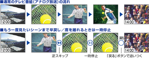 席を離れるときは一時停止、その後「戻る」ボタンで現在の映像に追いつくことが可能です。もう一度見たいシーンへは、「逆スキップ」ボタンで早戻しすることもできます。注6