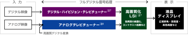 フルデジタル信号処理により、画質の劣化を極限まで軽減。テレビ映像の入力から出力までトータルでの映像美を追求することで、今までにない高画質な映像を表示します。