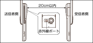 データの送受信が終わるまでは、相手側の赤外線ポート部分に向けたままにして動かさないでください。赤外線通信中に指などで赤外線ポートをおおわないようにしてください。直射日光が当たる場所や蛍光灯の真下、赤外線装置の近くでは、正常に通信できない場合があります。赤外線の通信距離は20cm以内でご利用ください。